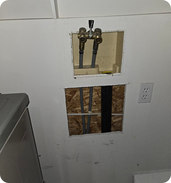 We carefully open the sections of drywall needed to access the Poly-B piping. After the replacement, our team will repair the area so the wall is ready to paint.